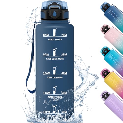 Grsta Vattenflaska 1 liter flaska med filter, läckagefri cykelflaska, vandringsflaska, lätt att bära, flaska med drickstider, för sport, gym, vandring, marinblå