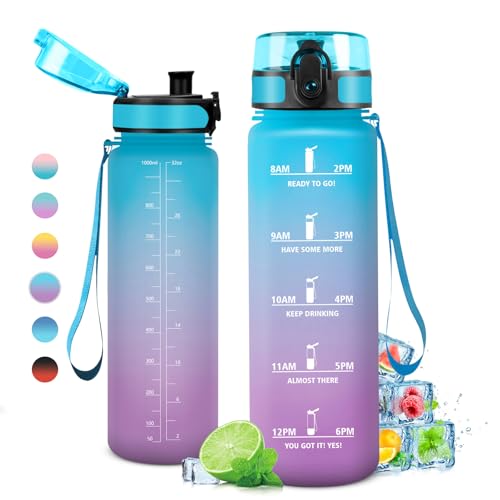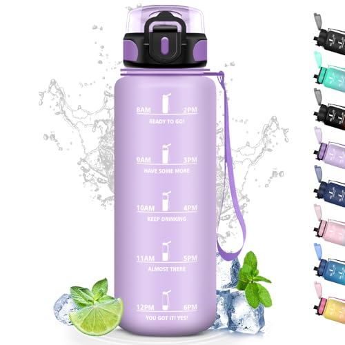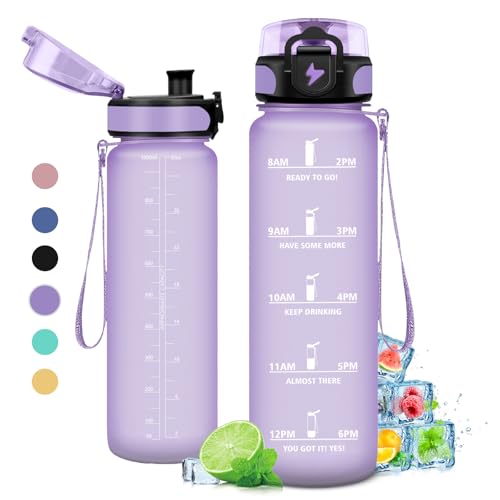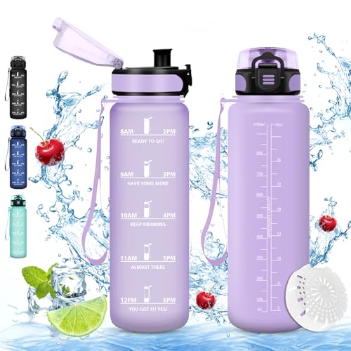 Grsta 1 liter vattenflaska, läckagefri, motiverande vattenflaska med tidsskala, vattenflaska med filter, lätt att rengöra, för sport, fitness, vandring, cykling, lila
