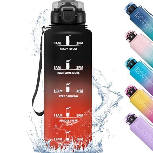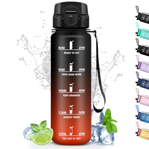 HoneyHolly Vattenflaska 1 l, läckagesäker med tidsmarkering, drickflaska sport, motiverande och med filter, vattenflaska, kolsyra, lämplig för cykel, utomhus, yoga, gym, fitness
