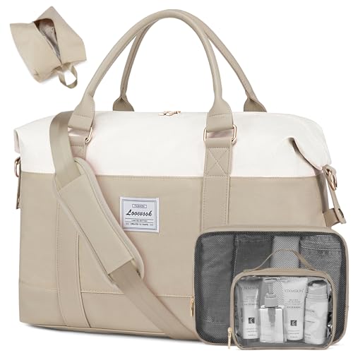 LOVEVOOK Resväska, sportväska, dam, weekender, resväska, klinikväska, födsel med toalettväska, skofack och våtfack, vattentät gymväska, handbagage, väska för flygplan resor, Beige, XL