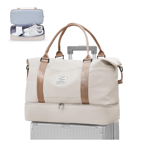 LOVEVOOK Resväska Sportväska Dam, Väska för Sport Resväska för Helger Väska för Klinik Förlossningsväska, Vattentät Gymväska med Skofack och Våtutrymme, Handbagageväska för Flygresor, Beige