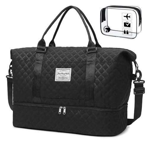BAGSMART Resväska sportväska dam, 31 l vattenavvisande buffert handbagage väska weekender bag quiltad laptopbagage med kosmetikväska, klinikväska födsel för gym, fitness, arbete, svart
