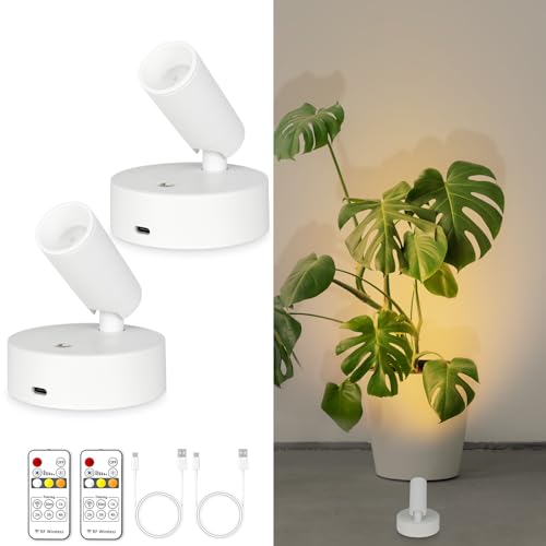 Lobolighting Uppladdningsbar LED-spotlight med fjärrkontroll, 2-pack batteridrivna spotlights trådlösa up-lampor inomhus bildljus med timer, dimbar upplysning, klistra på vägglampa för växtkonstverk