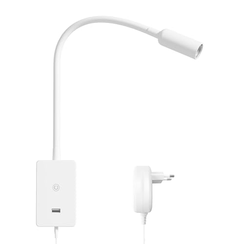 ENUOTEK Beröringsdimbar LED Vägglampa för Läsning vid Sänggaveln med Strömbortfallsminne, Vit Flexibel Väggmonterad Spotlight med 5V2A USB-Utgång, 4 Ljusstyrkenivåer, Neutral Vit Belysning
