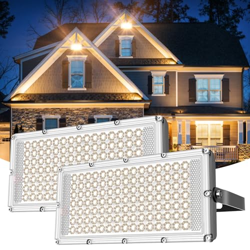 Viugreum 2-pack 100 W utomhus LED-strålkastare, IP66 vattentät spotlight säkerhet, superljus 8 000 lm arbet vägglampa för gård, trädgård, garage, hall, 3 200 K varmvit