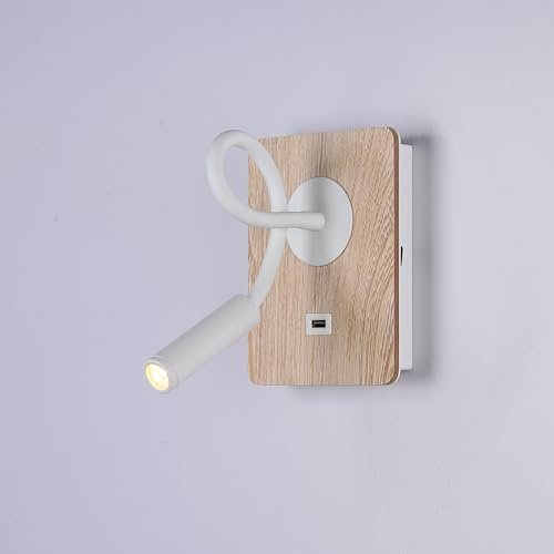 B·LED BARCELONA LED Vägglampa trä med strömbrytare och spotlight vit flexibel ljus varm vit port USB-laddning för läsning säng sängbord hotell