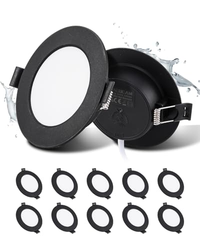 Grebeam 10-pack LED infällda spotlights 230V, 5W badrumsarmatur, IP44, 450LM, ultratunn 25mm, kallvitt 6000K, håldiameter 75–90mm, svarta takspotlights för kök och sovrum