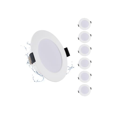 HCFEI Set med 6 LED infällda spotlights vit matt - rund platt 5 watt dimbar varm vit 3 000 K 230 V IP44 - lämplig för badrum, kök, bastu, utomhus - 65-75 mm borrhål, 120° strålvinkel