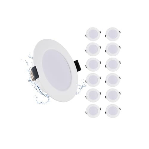 ALUSSO LIGHTING Set med 12 infällda LED-spotlights, 68 mm, 4 W, 230 V, infälld takspotlights, 3 000K, 4 000K, justerbar 6 500K, IP44, LED-badrumspotlight för vardagsrum, kök, vit, rund