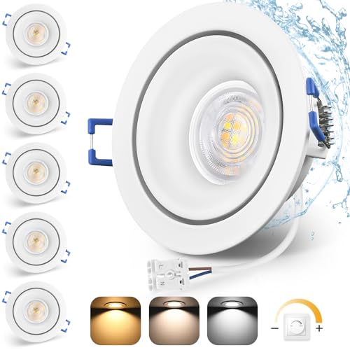 HCFEI Uppsättning av 3 LED infällda spotlights vit matt - rund platt 5 watt dimbar varm vit 3 000 K 230 V IP44 - lämplig för badrum, kök, bastu, utomhus - 65-75 mm borrhål, 120° strålvinkel
