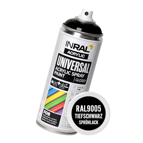 INRAL Sprayfärg – djupsvart matt RAL9005 universell sprayfärg 400 ml. Sprayburk för metall, plast, trä och sten – hög täckning, regn- och UV-beständig färgspray för inomhus- och utomhusbruk