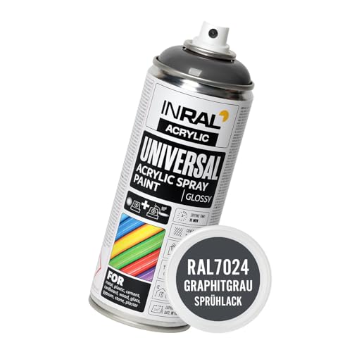 INRAL Sprayfärg – grafitgrå glänsande RAL7024 universell sprayfärg 400 ml. Sprayburk för metall, plast, trä och sten – hög täckning, regn- och UV-beständig färgspray för inomhus- och utomhusbruk
