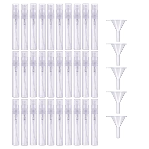 Lahviuu Mini sprayflaska, 30 stycken 2 ml transparent plast mini sprayflaskor atomizer parfym sprayflaskor, för parfym kroppsvård vätska kosmetika resor (med 5 stycken tratt)
