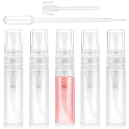 Bewudy 5 st mini sprayflaska, 10 ml plastsprayflaska med 3 st pipetter, fin dimma påfyllningsbar parfymflaska, atomizer klar reseflaska (5 ml)