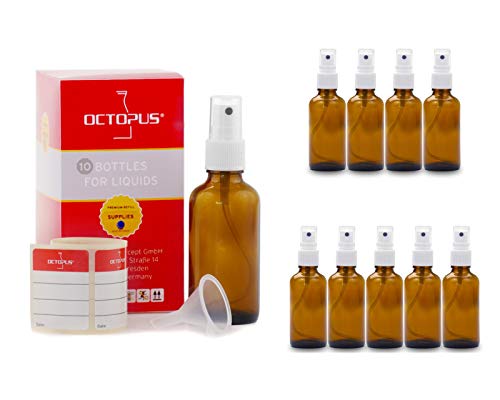 Octopus 10 x 50 ml tonade glasflaskor med sprayflaska, mini-tratt + etiketter, sprayflaskor med UV-skydd