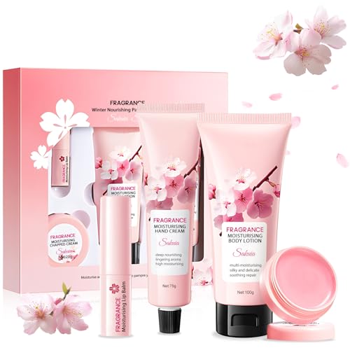 Presentset för kvinnor, Sakura vårdset damer, kroppsvårdsset, duschgelset damer gåva med kroppslotion, handkräm, läppbalsam, kräm för sprucken hud, mild och bekväm, 4 delar
