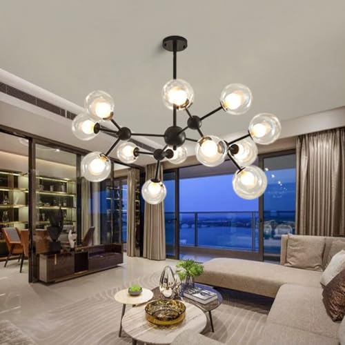 Sputnik ljuskrona, modern 12-ljus taklampa med glasskärm 31'' industriell taklampa för vardagsrum sovrum matsal, svart, 12 lampor HGCHH