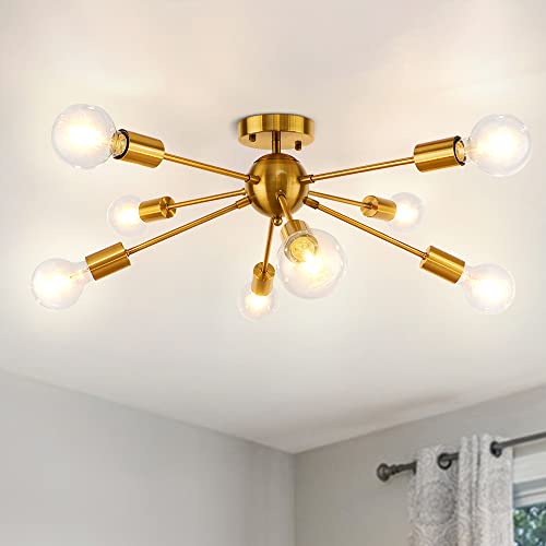 LynPon modern sputnik-taklampa, 8-ljus, borstad mässingsfinish, ljusarmatur i guld i 50-talsstil för vardagsrum, sovrum, kök, bar, restaurang