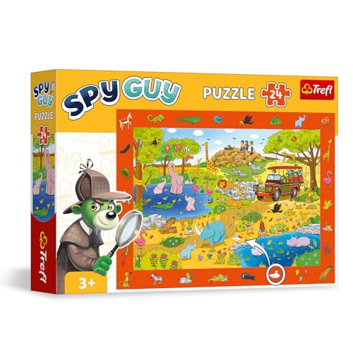 Trefl - Observationspussel Spy Guy: Safari - 24 bitar - Hitta alla föremål från ramen, Färgglatt pussel fulla av detaljer, Perceptiv träning för barn över 3 år