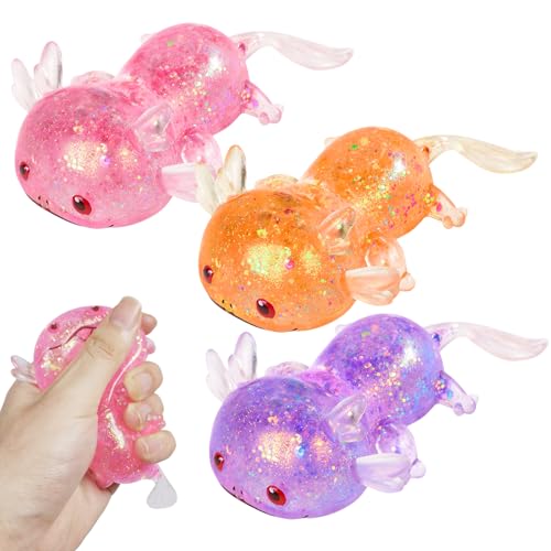 3 stycken Axolotl-leksaker, Axolotl Squishy-leksak, Axolotl, glitter, klämleksak, för att minska stress, avslappnande sensoriska leksaker, stressboll, klämboll, vuxna, barn, för fest,