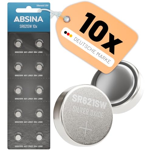 ABSINA SR621SW klockbatteri 1,55 V silveroxid 10-pack – knappcell SR621SW läckagesäker och lång hållbarhet – batteri SR621SW/LR621/SR621/364/V364/R60/AG1 – SR 621 SW klockknappcell