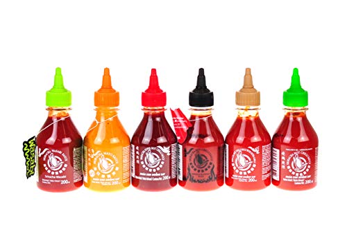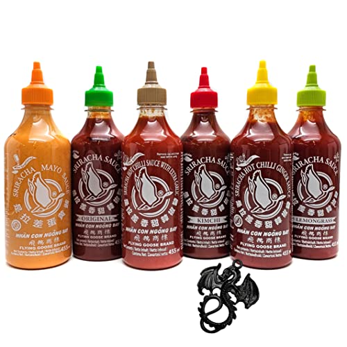 Uppsättning av 6 Sriracha Hot Chilisås Flying Goose olika sorter 6 x 455 ml chili sås med drakhänge