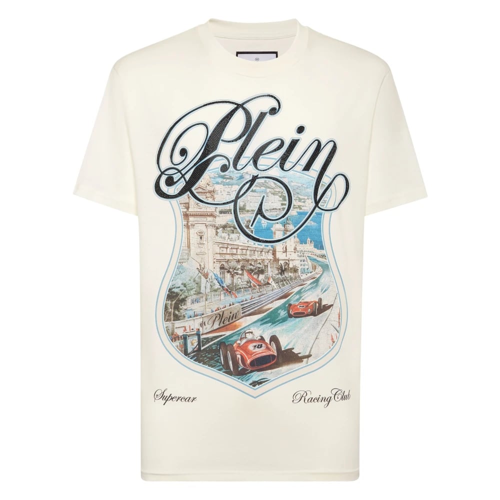 Philipp Plein, Toppar , Herr, S, Bomull, T-shirt Rund Hals SS Racing Car Stones