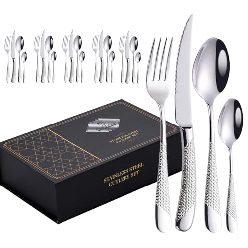 Bestickset bestick set, högglanspolerat rostfritt stål 18/10, inklusive kniv, gaffel, sked matservis för hem, hotell, restaurang, nytt hus (silver, 24 st)