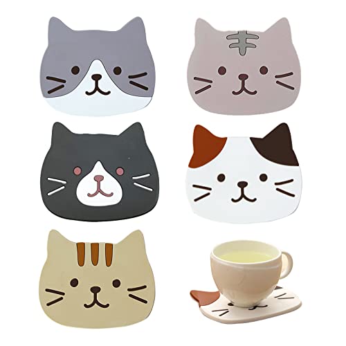 TSHAOUN 5 st söta kattkoppsunderlägg, återanvändbara glasunderlägg i silikon, halkfria, tvättbar värmebeständig glaskopp, gummidyna, matta, nyhet för vinglas, nytt hem köksdekor, gåva (5 färger)