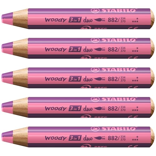 STABILO Duo färgpenna, vattenfärg och vaxkrita Woody 3 i 1 duo – tvåfärgad blyerts – 5-pack – rosa/erika