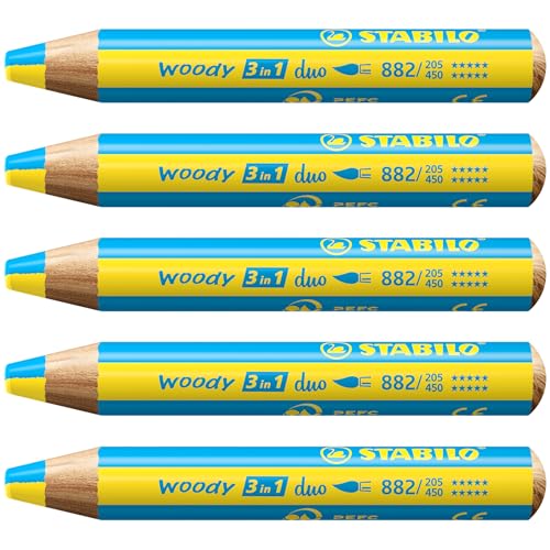 STABILO Duo färgpenna, vattenfärg och vaxkrita Woody 3 i 1 duo – tvåfärgad bly – 5-pack – gul/cyanblå