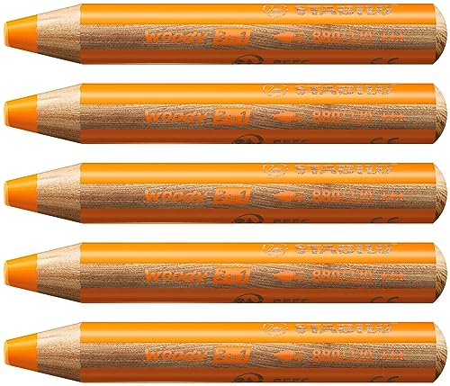 STABILO Duo färgpenna, vattenfärg och vaxkrita Woody 3 i 1 duo – tvåfärgad stift – 5-pack – orange/svart