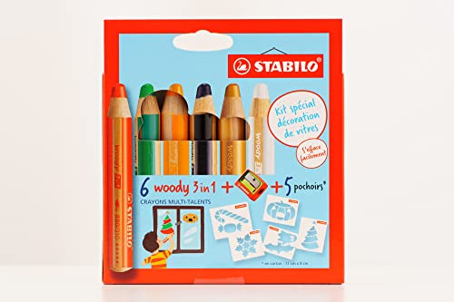 Färgpenna, vattenfärg och vaxkrita – Stabilo Woody 3 i 1 – 6-pack med pennvässare 5 stenciler – med 6 olika färger