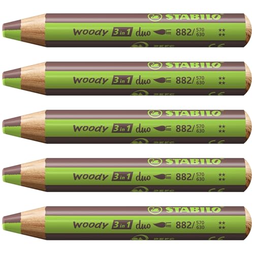 STABILO Duo färgpenna, vattenfärg och vaxkrita Woody 3 i 1 duo – tvåfärgad blyerts – 5-pack – ljusgrön/brun