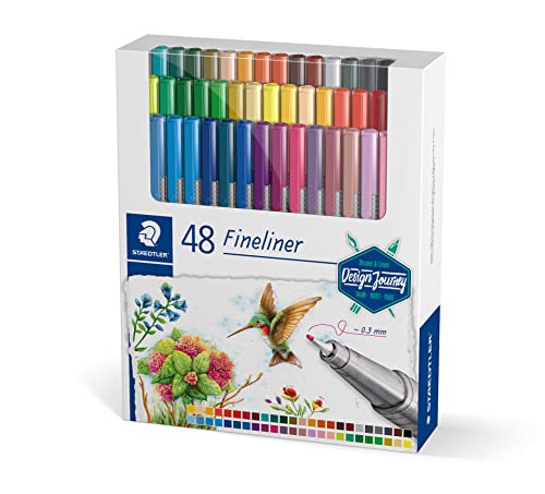 STAEDTLER Fineliner Triplus Design Journey, ergonomisk triangelskaft, superfin, metallinfattad 0,3 mm spets, lång livslängd, 48 fineliner i blandade färger i kartongfodral, 334 C48-C