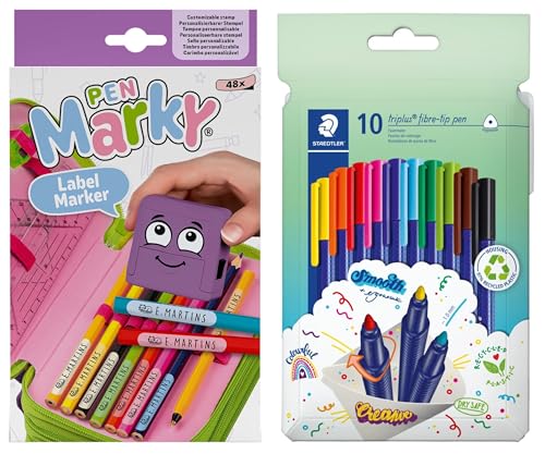 COLOP Pen MARKY markeringsset med svart bläck för märkning för pennor och skoltillbehör, inkl. 10 STAEDTLER triplus color filtpennor 323, trekantig, imponerande spets, ca 1 mm, 97% recyklat