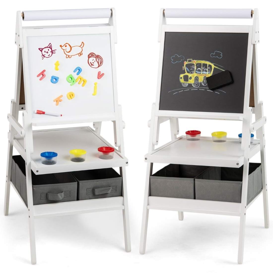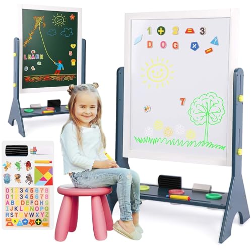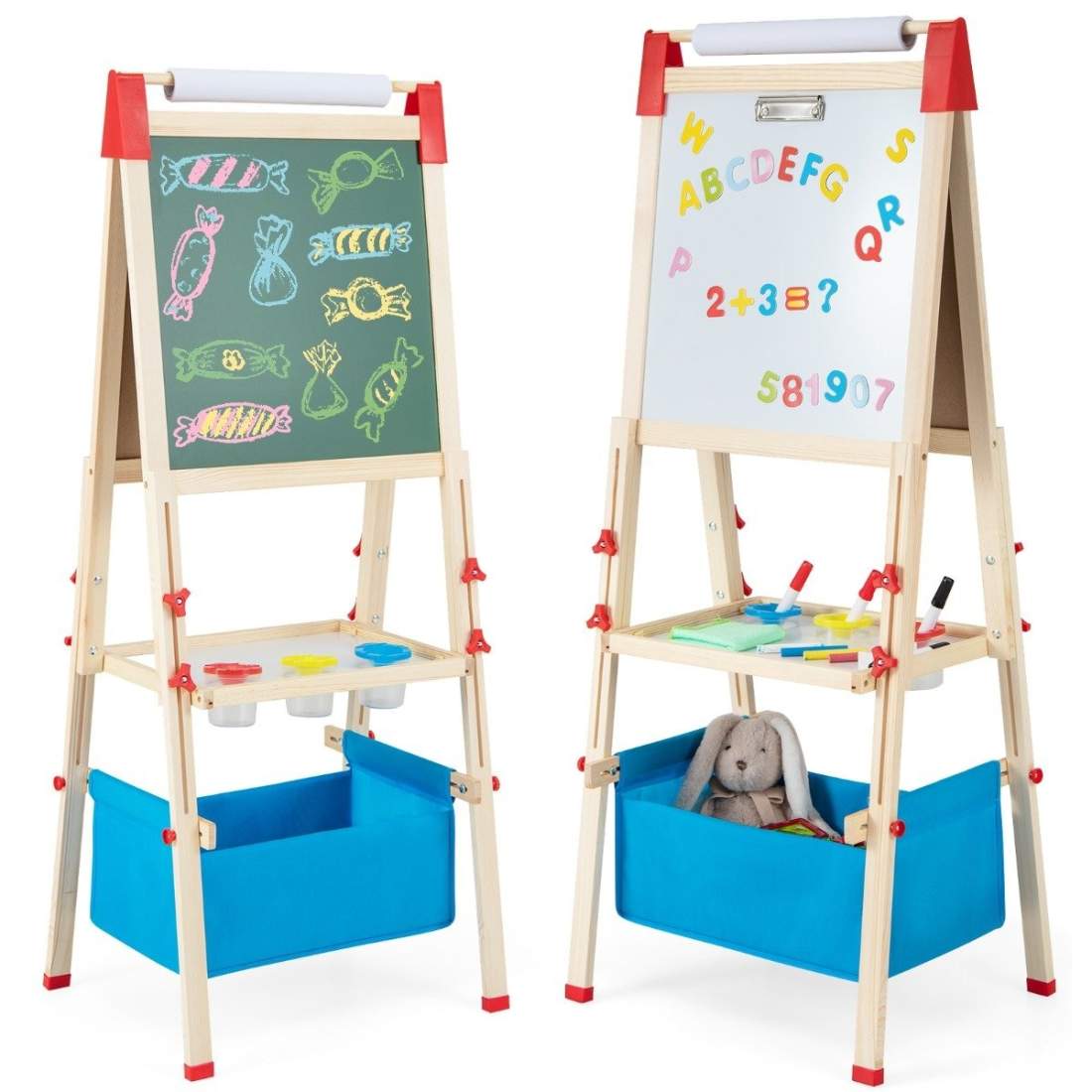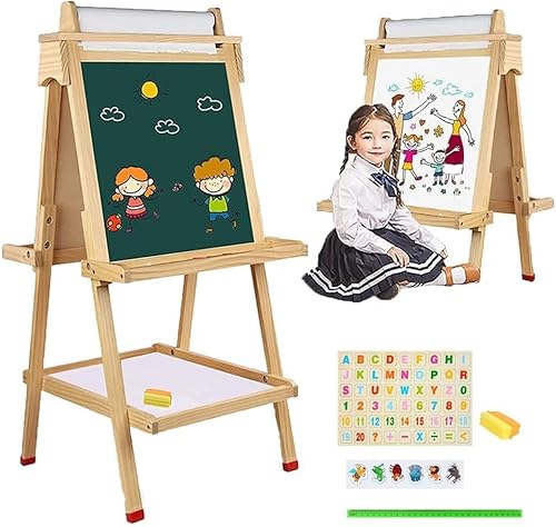 2-i-1 barn träkonst staffli dubbelsidig justerbar stående stor skrivning och ritning whiteboard och tavla med magnetiska tillbehör för barn pojkar flickor