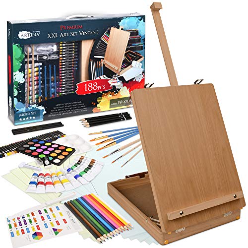 "Artina 188 Delar Staffli Set Vincent - Målningsset för Vuxna och Barn - Med Låda Staffli Olja Pastell Akryl Färger Vattenfärger Kolpennor "