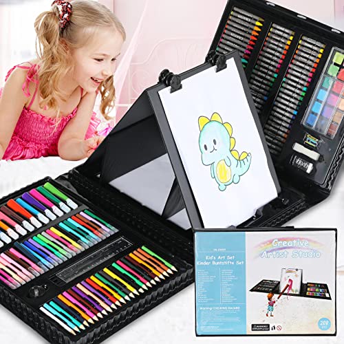 208 delar målningsset för barn, bärbart målerifodral, ritfodral, målningsset med vaxkritor, staffli, akvarellpennor, pastellfärger, palett i utmärkt kvalitet