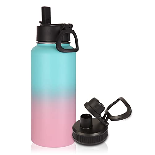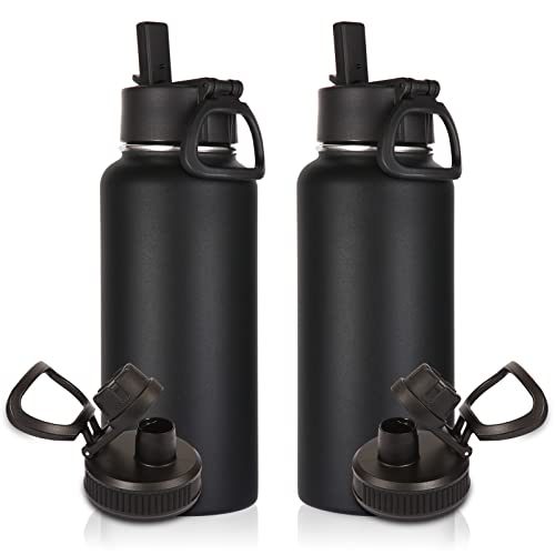 Volhoply 1L isolerade vattenflaskor Bulk 2 Pack med halmlock & Spout Lid, Stainless Steel Sports Water Bottle, Double Wall Vacuum Cups, Leakproof Wide Mouth Metal Flask for Hiking, Camping