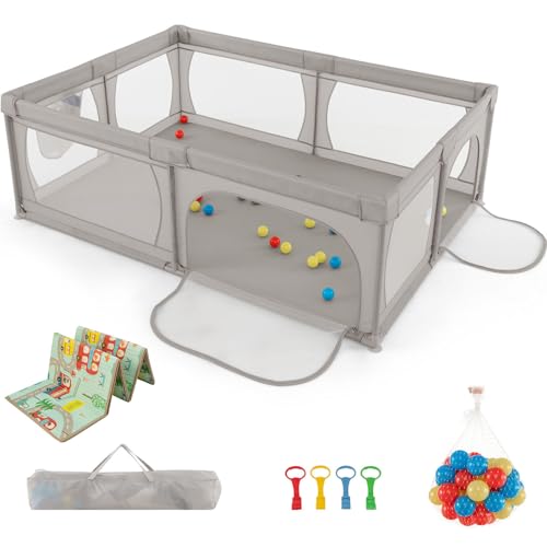 LIFEZEAL Lekhage för barn och småbarn 0–3 år, staket, stor 206 x 147 cm, med madrass, väska, handtag, bollar, skyddskant, dörrar med dragkedja, lekplats, aktivitetscenter, grå