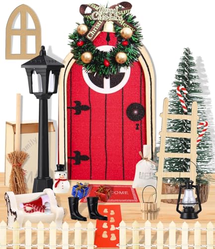 SOBEAU Jultomte komplett uppsättning dörr, 25 stycken miniatyr tomtetillbehör, tomtedörrset med brevlåda, staket, stege, tomtedörr tillbehör jul, juldekoration tomtehus presenter för barn