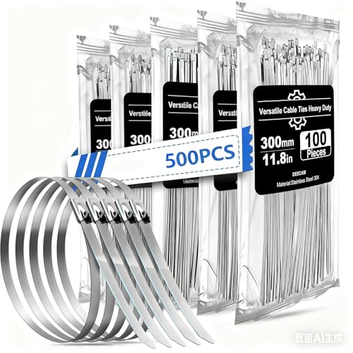 Deecam buntband rostfritt stål 300 mm x 4,6 mm, Stålband för flera ändamål i metall, axelkängor för avgaslindning, kabelbuntning, trädgårdsskötsel, hårda staket och markiser (500 stycken)