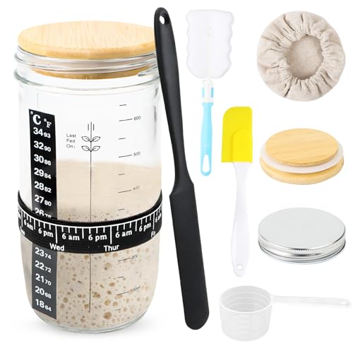 Surdeg startset, 700 ml sourdough-jäst glas med träskydd, rostfritt stålskydd, tyglock, positioneringstejp, temperaturklistermärke, mätsked, svart skrapa, gul blandningskniv, svampbyrå