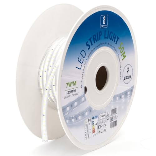 Glowster 50 meter, 8 mm bred vit LED-remsa med integrerad krets, idealisk för dekoration, stämningsbelysning och kreativa projekt som kräver flexibilitet och ljuskvalitet.
