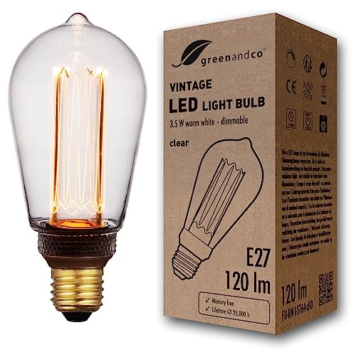 greenandco LED vintage glödlampa för stämningsbelysning | dimbar | E27 ST64 | klar | 3,5 W 120 lm | 1800 K extra varm vit | 320° | 230 V | flimmerfri | Edison-glödlampa