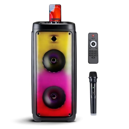 Bluetooth-högtalare med mikrofon – musikbox med stämningsbelysning – festbox och karaoke mikrofon – soundboks med Bluetooth, Aux och USB-ingångar – lätt att transportera med handtag – svart
