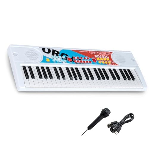 KOMFOTTEU Digitalt piano med 49 tangenter, barnpiano med strömförsörjning med dubbla lägen, 8 rytmer, 8 stämplar och 10 demos, elektroniskt tangentbord med mikrofon, för barn från 3 år (vit)