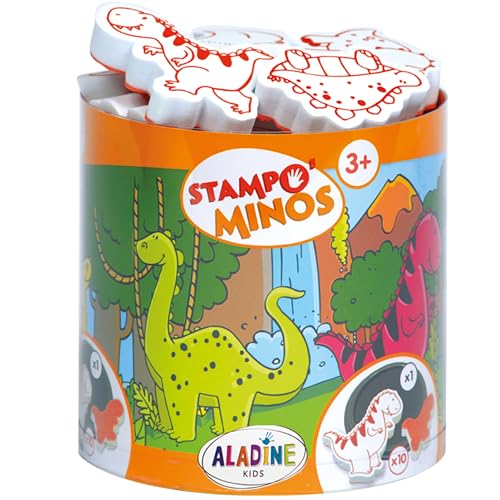 Aladine Dinosaurie 3085123 stämpelset Minos Dino, inkl. 10 stämplar och 1 stämpelkudde, kreativ stämpelkul för barn från 3 år, stor