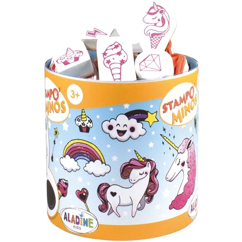 Aladine 85145 Stampo stämpelset Minos enhörningar, inklusive 18 stämplar och 1 stämpelkudde, kreativ stämpel kul för barn från 3 år, flerfärgad